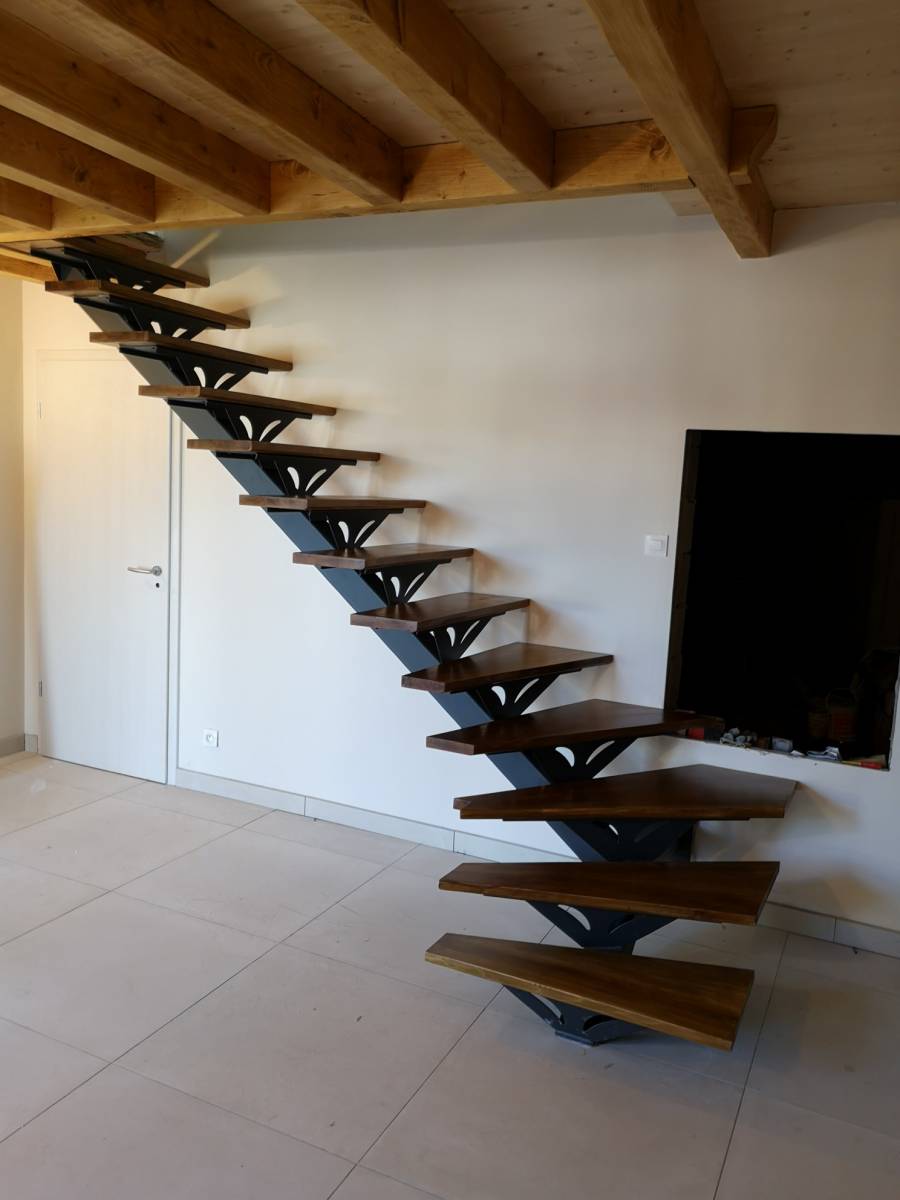 Nous avons créée pour une cliente sur la commune de Chaponost, unescalier quart tournant avec limon central et découpe laser.