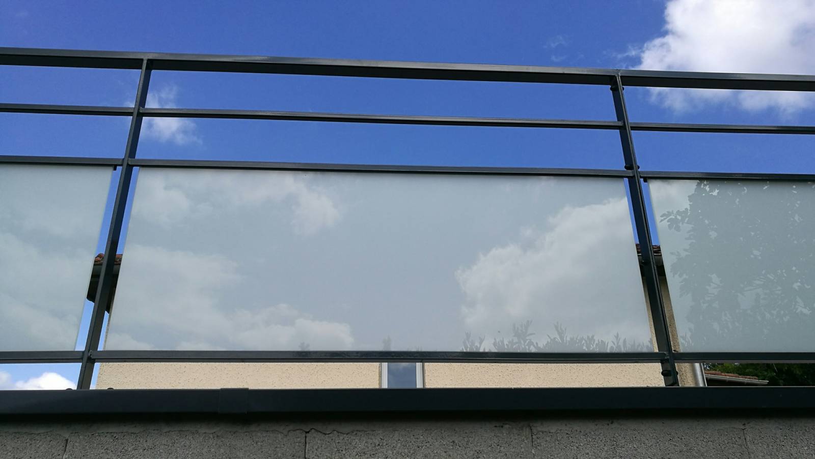 C'est un vitrage sécurisé, feuilleté 44/2 dépoli avec parcloses de maintien. L'ensemble a été traité en époxy RAL 7016 brillant. La pose a été effectuée par chevillage sur des bavettesaluminium. si besoin vous pouvez nous contacter pour tout type de réalisation sur la commune de Brignais et ses alentours.