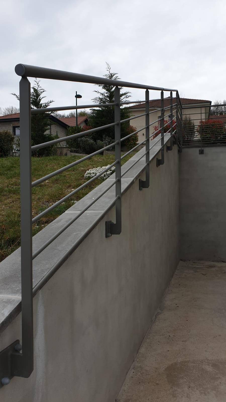 La société Grillon Rémy Métallerie a réalisé pour le compte d'un client à Domarin un garde-corps rampant pour sécurisé un extérieur. Il est à la fois simple, épuré et moderne et se marie très bien au style de la maison.